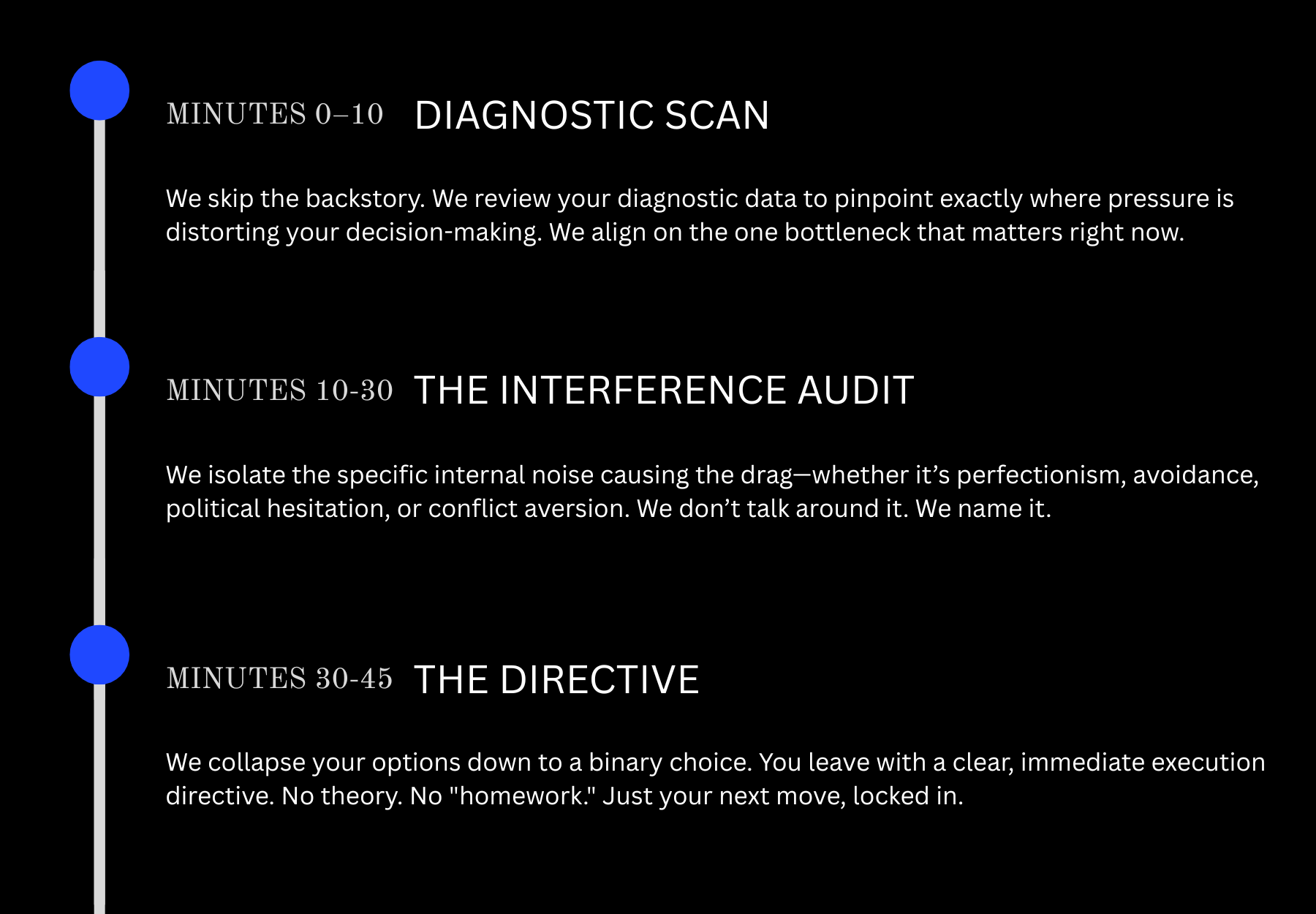 A 45-minute executive reset. Private. One-on-one. For leaders who know what to do and want to move faster.